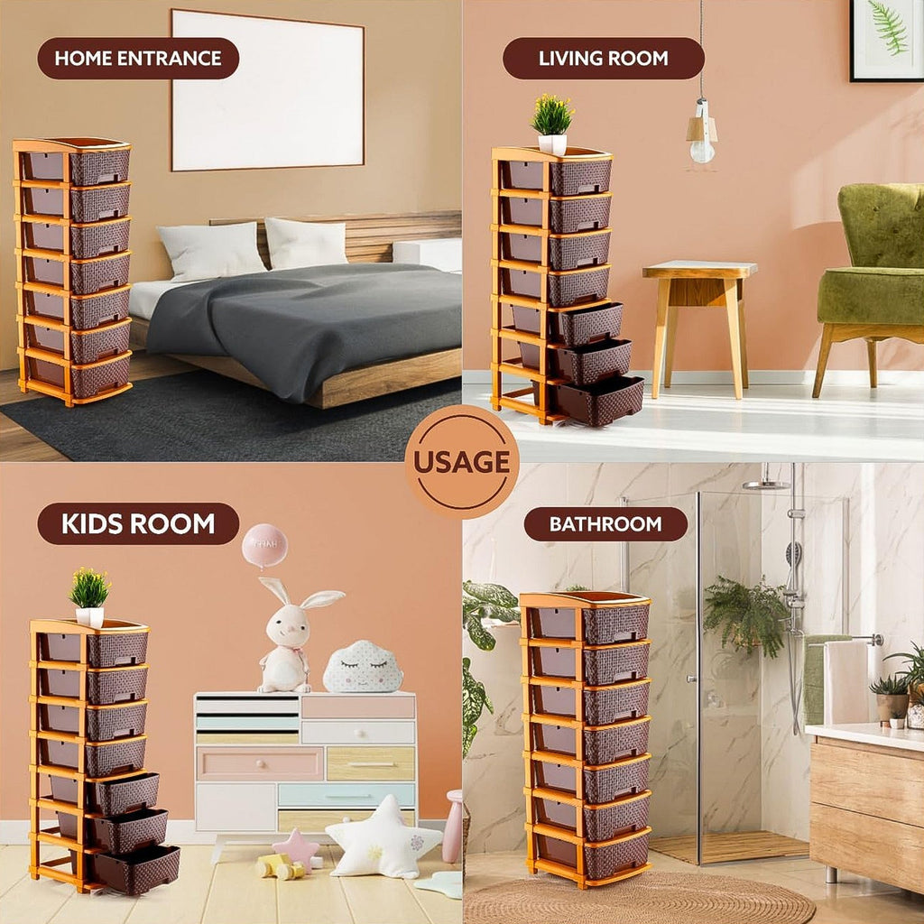 7-Layer Multipurpose Plastic Storage Drawer Organizer with Woven-Texture Design – Modular and Stackable Storage Cabinet for Home, Bedroom, Office & Kids’ Room – Sturdy Plastic Frame with Brown Box Packaging