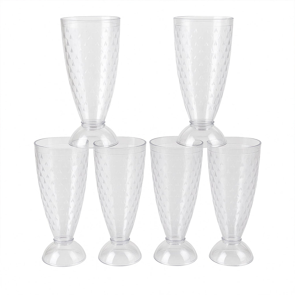 This 6-piece set of 400 ml transparent plastic milkshake glasses combines style, utility, and durability in one elegant package. Designed with a crystal-textured exterior and solid footed base, these reusable plastic glasses offer a premium glass-like appearance while being completely shatterproof and safe for all age groups. Whether you're serving milkshakes, faloodas, juices, cold coffees, or layered desserts, this set brings a touch of sophistication to your beverage presentation.